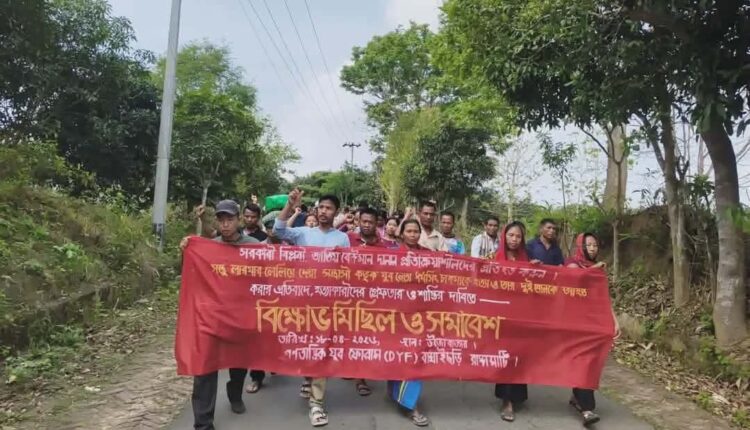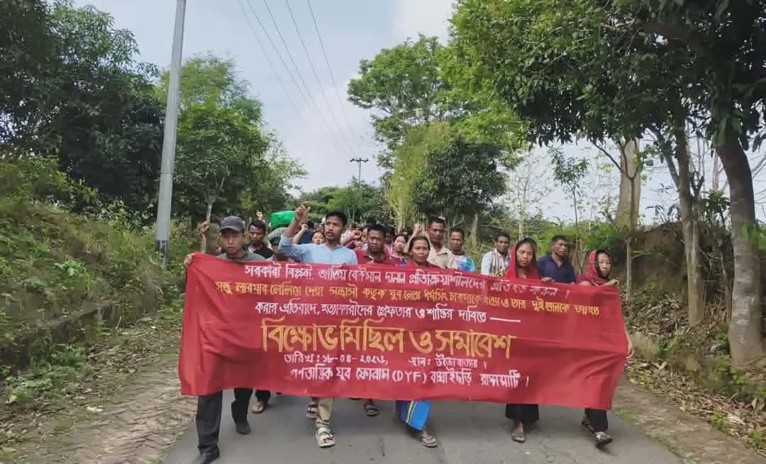 পার্বত্য জেলা রাঙামাটির কুতুকছড়িতে গণতান্ত্রিক যুব ফোরামের কেন্দ্রীয় সহ-সভাপতি ধর্মসিং চাকমাকে গুলি করে হত্যা এবং দুই নারীকে গুলিবিদ্ধ করার ঘটনার প্রতিবাদে বাঘাইছড়ি উপজেলার সাজেক ইউনিয়নের উজোবাজার এলাকায় বিক্ষোভ মিছিল ও সমাবেশ অনুষ্ঠিত হয়েছে।